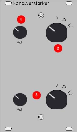 Der Kanalverstärker dient als Hauptlautstärkeregler für die einzelnen Kanäle. Hier werden die verschiedenen Steuerspannungen von Manual und Pedal zusammengeführt. Ebenso wird hier entschieden, ob die Signalstärke von Manual/Pedal oder von den Schlagwerken 1 und 2 gesteuert wird. |