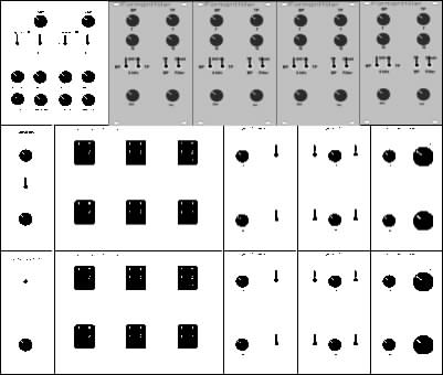Die Formantfilter (FF) sind das mächtigste Werkzeug des Trautoniums zur Klangbeeinflussung. Für jeden Kanal steht ein eigener Filter zur Verfügung, der sich auch in einer eigenen Baugruppe befindet. Die FF sind das letzte Glied in der Signalkette bevor die 4 Kanäle wieder zusammengeführt werden. Pro FF kann zwischen Bandpassfilter und Tiefpassfilter gewählt werden. |